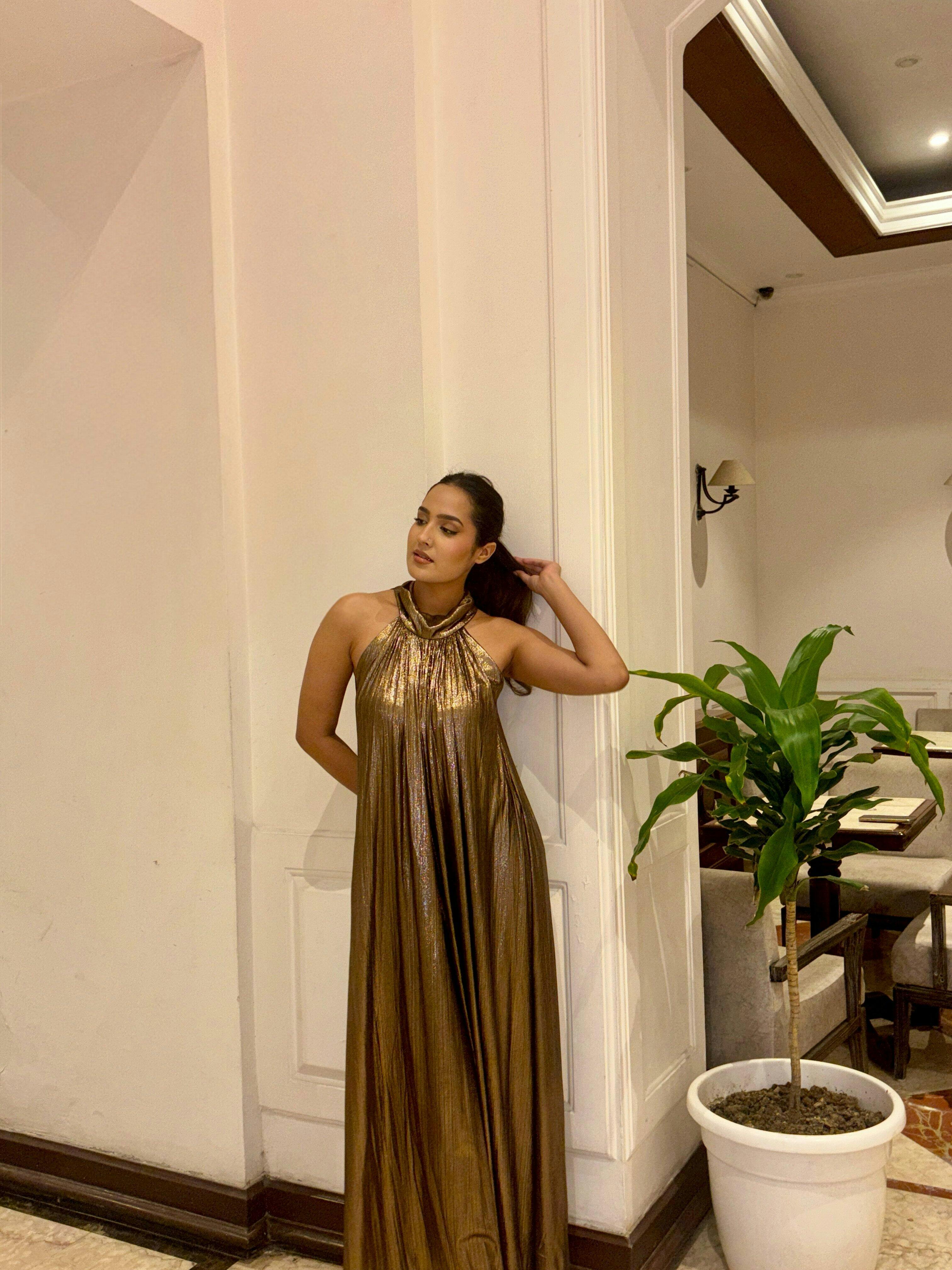 The halter neckline adds a sophisticated edge, accentuating the shoulders while offering a graceful, elongating effect. The jumpsuit flows effortlessly into a wide-leg silhouette, giving it the illusion of a gown while offering the ease and comfort of a one-piece. The rich metallic finish shifts between golden and copper tones, catching the light beautifully with every step you take.