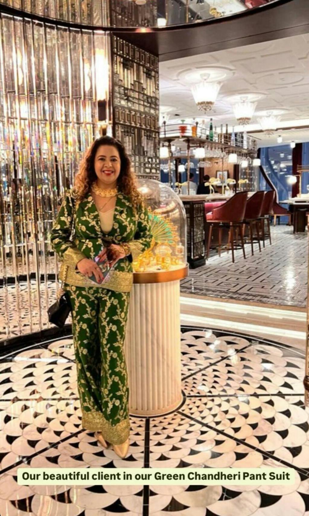 Introducing our Jade Blossom Suit, a stunning fusion of traditional charm and modern sophistication. Crafted from luxurious fabric, this set features a rich emerald, green base adorned with intricate golden floral motifs. The soft sheen of the fabric enhances the opulence, while the comfortable fit makes it perfect for both festive occasions and elegant soirées. The set includes a tailored coat with delicate golden borders and matching pants that offer a graceful silhouette. Step into the spotlight with this effortlessly chic ensemble that marries timeless tradition with contemporary style.